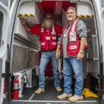 Paul Stillitano of Avonmore, right, and his colleague Dennis Bayne of Plum pose for the media representatives at the American Red Cross parking lot in Pittsburgh on Thursday, Oct. 3, 2024. Two local Red Cross members are being deployed to North Carolina to help with relief efforts. Dennis Bayne of Plum and Paul Stillitano of Avonmore will take a Red Cross van to distribute meals, water, and relief supplies.