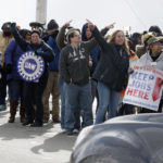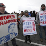 Signs with sayings such as “Save this Plant” were scattered outside the plant where about 100 workers gathered to say goodbye in the cold.