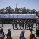 A few dozen Israeli activists opposed to Israel’s decision to allow aid into Gaza while Hamas still holds Israeli hostages attempted to block the trucks carrying the aid on Wednesday morning, but were kept back by Israeli police.