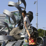 Benjamin Von Wong, a Canadian artist and activist, designed the nearly 18-foot sculpture called the “Thinker’s Burden” and built it with a team. It’s his take on the famous sculpture by Auguste Rodin, “The Thinker” in Paris. There is a male figure in deep thought, like Rodin depicted. But instead of sitting atop a rock, Von Wong’s figure sits atop Mother Earth while cradling a baby and clutching plastic bottles. A strand of DNA intertwines them to highlight the health impacts of plastic pollution.