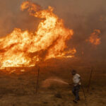 Jaime Hernandez sprays water to defend his home while battling approaching flames from the Mountain Fire in Moorpark, California. Hernandez has been staying behind to help fight multiple wildfires since 1988.