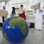Also Sunday, protests began in earnest: In one on health, a group gave mock resuscitation to an inflatable Earth.