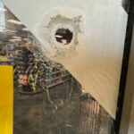 The CVS remained closed Saturday morning, with an apparent bullet hole in its front door. A lone bouquet was placed outside the building.