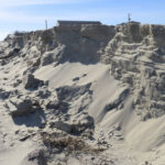 He walked along the beach where the surging surf punched a hole in the dunes, completely obliterating them for about 20 feet (6 meters). On either side, all that remained were sand piles that barely reached his knees. Elsewhere along the beachfront, dunes that had been about 18 feet (5.5 meters) high last summer were less than half that height — and much lower than that in numerous places.