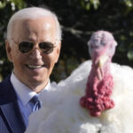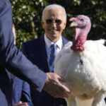 “The peach pie in my state is one of my favorites,” he said during remarks that were occasionally interrupted by Peach gobbling atop the table to Biden’s right. “Peach is making a last-minute plea,” Biden said at one point, drawing laughter from an overflow crowd that included Cabinet members, White House staff and their families, and students from 4H programs and Future Farmers of America chapters.