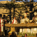 The sunset’s yellow light coming through the cedar branches bathed the leader of Lebanon’s Maronite Church, Patriarch Beshara al-Rai, as he stood at a wooden podium and delivered a sermon. Then the gathering sang hymns in Arabic and the Aramaic language.