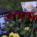 At Wagner’s headquarters in St. Petersburg, lights were turned on in the shape of a large cross, and Prigozhin supporters built a makeshift memorial, piling red and white flowers outside the building Thursday, along with company flags and candles.