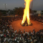 In many parts of India, people also light large bonfires the night before the festival to signify the destruction of evil and victory of good. Families gather around the flames to sing, dance and pray to Hindu gods.