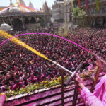 Amid massive celebrations in the west Indian city of Ahmedabad, thousands of people gathered at temple were sprayed with colored water from huge pipes as they swayed to traditional Gujarati music, clapping over their heads.