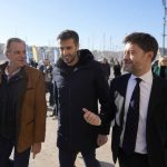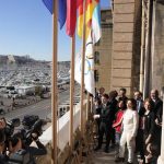 Mayor of Marseille Benoit Payan, center, raises the Olympic flag with Head of Paris 2024 Olympics Tony Estanguet, center right, after a press conference at the Marseille City Hall, southern France, Friday, Feb. 3.