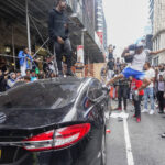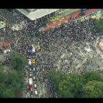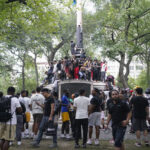 Aerial TV news footage showed a surging, tightly packed crowd running through the streets, scaling structures in the park and snarling traffic. Shouting teenagers swung objects at car windows, threw paint cans and set off fire extinguishers. Some people climbed on a moving vehicle, falling off as it sped away. Others pounded on or climbed atop city buses.