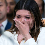 Standing next to him, Abrego Garcia’s wife, Jennifer, wiped away tears as the senator shared her husband’s comments about missing his family.