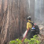 A firefighter sprays water on a sequoia tree near the lower portion of the Mariposa Grove as smoke rises from the Washburn Fire in Yosemite National Park, Calif., Thursday, July 7, 2022. A portion of Yosemite National Park has been closed as a wildfire rages near a grove of California’s famous giant sequoia trees, officials said.