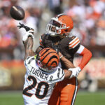 Both of the picks were the result though of the ball going off the hands off Browns receivers and the Bengals’ defensive backs making great plays.