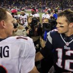 In this Jan. 18, 2004, file photo, New England Patriots quarterback Tom Brady, right, talks with Indianapolis Colts quarterback Peyton Manning after the Patriots’ 24-14 win during their AFC Championship game in Foxborough, Mass.