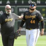 Pirates first baseman Rowdy Tellez leaves the field with trainer Tony Leo against the Cubs on Wednesday, Aug. 28, 2024, at PNC Park.