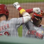 Barnhart’s homer was one of four by the Reds, and third baseman Eugenio Suarez accounted for the other three. Suarez was 3 for 4 with five RBIs in his first career three-homer game, hitting Nos. 10, 11 and 12 for the season. He also homered in the second game of Friday’s doubleheader.