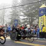 Marcel Hug of Switzerland won the men’s wheelchair race in a course record time — his sixth victory here — and American Susannah Scaroni won her first Boston title despite having to stop early to tighten a wheel that began to wobble on the bumpy pavement.