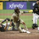 David Bednar (0-3) got Machado looking at a 98-mph fastball for a called third strike, but when he threw a 1-0 curveball in the dirt for a wild pitch, Tatis raced home and his slide beat catcher Joey Bart’s tag for the go-ahead run to give the Padres a 2-1 lead.