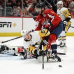 Settling a loose puck behind the Capitals’ net, Penguins forward Evgeni Malkin circumnavigated his way to the left half-wall and flicked a clever backhand pass between the hashmarks for Karlsson who pumped a wrister by goaltender Charlie Lindgren’s glove. It was Karlsson’s first goal in nearly a month (Oct. 10). Malkin and linemate Sidney Crosby had assists.