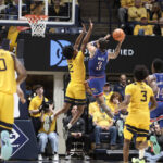 White’s 3-pointer gave Kansas its largest lead, 59-51, before West Virginia scored 16 unanswered points to move ahead to stay. Jasper Floyd, held scoreless until that point, had seven points during the run that put the Mountaineers ahead 67-59 with 8:36 left.