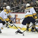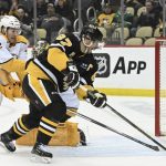After Penguins forward Sidney Crosby beat Predators forward Colton Sissons on a draw in Nashville’s left circle, Penguins defenseman Kris Letang corralled the puck at the left point then sauntered his way to the center point before flicking a forehand pass to the left half wall for forward Rickard Rakell. Maneuvering low into the left circle, Rakell snapped a sharp forehand pass to the far side of the crease, where Guentzel deflected the puck with the forehand of his stick blade past the left skate of a valiant Saros, who made 43 saves on 45 shots. Rakell and Letang logged assists.