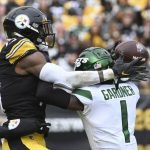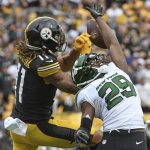 The Jets’ Lamarcus Joyner breaks up a pass intended for the Steelers’ Chase Claypool in the third quarter Sunday, Oct. 2, 2022, at Acrisure Stadium.