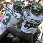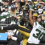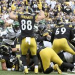 Pickett, who replaced starter Mitch Trubisky after halftime, threw a 26-yard completion to George Pickens that set up the Steelers at the Jets 31 and the clock winding inside five minutes. But a bad exchange on a pitch to Jaylen Warren lost 5 yards. Pickett then scrambled and threw high toward the sideline. Tight end Pat Freiermuth got his hand on the ball, knocking it into the air. Jets safety Michael Carter II intercepted at the 35 with 3:34 to play.