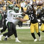 The Steelers’ Malik Reed gets held by the Jets’ Conor McDermrmott in the quarter fourth quarter Sunday, Oct. 2, 2022, at Acrisure Stadium.