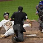 Pirates third baseman Ke’Bryan Hayes scores past Cubs catcher Willson Contreras during the 10th inning Tuesday, Sept. 1, 2020, at PNC Park.