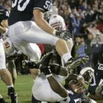 A rare meeting when both teams were unranked, freshman Zack Mills stepped in to lead a comeback victory for the Nittany Lions at Beaver Stadium and give coach Joe Paterno his 324th career win, passing Alabama’s Bear Bryant for the most victories in NCAA history.