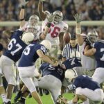 Penn State’s special teams came through in a big way as the Nittany Lions upset the No. 2 Buckeyes at Beaver Stadium. Marcus Allen blocked Tyler Durbin’s 45-yard field-goal attempt, and Grant Haley returned it 60 yards for a touchdown with 4:27 left to give Penn State the lead. The Nittany Lions, who had trailed 21-7 entering the fourth quarter, then sacked J.T. Barrett twice on Ohio State’s ensuing possession to seal the win. It was the first win over a ranked team for third-year coach James Franklin.
