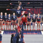 There are a handful of specific roles on each team, with every athlete wearing a number. “Bases” provide support through lifts or by doing backbends that allow teammates to stand on their stomachs (yes, really) while creating pyramids. “Tops” can be lifted as high as 10-15 feet in the air and then dismount by flipping or twisting into the arms of “back spots” (like something you might see at a football game). Tumblers somersault their way from one end of the mat to the other, sometimes in synchronicity with each other.