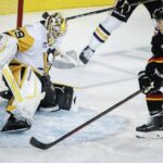 Penguins defenseman Matt Grzelcyk pinched into the Flames zone to keep a puck inside the blue line, but that decision allowed Kirkland to generate a two-on-one rush through the neutral zone with Andersson. After Kirkland gained the Penguins’ blue line on the right wing, defenseman Erik Karlsson applied pressure as a hustling Grzelcyk hurried back and poke-checked Kirkland’s stick, appearing to momentarily break up a pass attempt. The puck still managed to sluggishly slide in toward the crease where Andersson darted in and swatted a forehand shot by Nedeljkovic’s glove. Kirkland and forward Ryan Lomberg had assists.