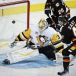 Just after a power-play opportunity for the visitors expired, Penguins forward Kevin Hayes gained the offensive zone on the left wing but lost possession on a poke check by Flames defenseman Danil Miromanov. The puck slid to the lower left circle where Rakell recovered it, spun backward to his left and chucked a wrister toward the crease from a nearly straight angle. The puck struck off the inside of goaltender Dustin Wolf’s left skate and deflected into the crease. Hayes and Grzelcyk garnered assists.