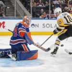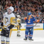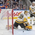 Tapping a puck past Penguins forward Kevin Hayes at the blue line near the visiting bench, Oilers forward Leon Draisaitl surged through the neutral zone and gained the Penguins’ zone on the right wing. As Penguins defenseman Kris Letang applied passive pressure, Draisaitl accepted the free real estate and fired a deceptive wrister to the far side by Blomqvist’s blocker. The puck clunked off the post and rattled into the cage for Draisaitl’s fourth goal of the season. Linemate Viktor Arvidsson and defenseman Evan Bouchard had assists.