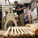 Mike Dennison, a brand ambassador from Louisville, Ky., who works at the Louisville Slugger Museum and Factory, uses a turning lathe Saturday to show Pirates fans the traditional way wooden baseball bats were created during PiratesFest.