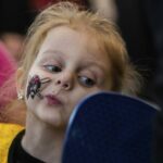 Gracie Stubenbort, 5, of Monroeville checks her Pirates logo face paint in the mirror Saturday while with her dad, Chad Stubenbort, at PiratesFest at the David L. Lawrence Convention Center in Downtown Pittsburgh.
