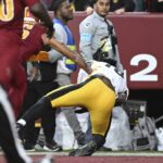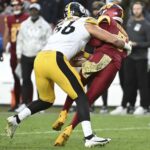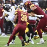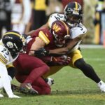 Steelers linebacker Patrick Queen drops the Commanders’ Austin Ekeler for a loss in the first quarter on Sunday, Nov. 10, 2024, at Northwest Stadium in Landover, Maryland.