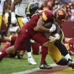 The Commanders’ Austin Ekeler scores through the Steelers’ Keeanu Benton in the first quarter on Sunday, Nov. 10, 2024, at Northwest Stadium in Landover, Maryland.