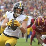 Steelers tight end Pat Freiermuth scores a touchdown against the Commanders in the second quarter on Sunday, Nov. 10, 2024, at Northwest Stadium in Landover, Maryland.