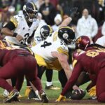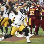 The Steelers’ Broderick Jones celebrates after the Commanders’ Jer’ Zhan Newton went off sides for a Steelers first down on Sunday, Nov. 10, 2024, at Northwest Stadium in Landover, Maryland.