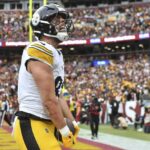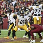 Steelers tight end Pat Freiermuth celebrates his second-quarter touchdown against the Commanders on Sunday, Nov. 10, 2024, at Northwest Stadium in Landover, Maryland.