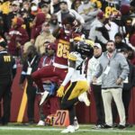 The Steelers James Pierre defends on a pass intended for the Commanders’ Noah Brown late in the fourth quarter on Sunday, Nov. 10, 2024, at Northwest Stadium in Landover, Maryland.