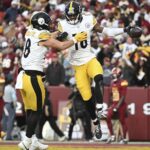 The Steelers’ Pat Freiermuth celebrates with Mike Williams after Williams fourth quarter touchdown against the Commanders on Sunday, Nov. 10, 2024, at Northwest Stadium in Landover, Maryland.