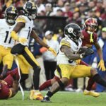 Steelers running back Jaylen Warren cuts back on the Commanders in the fourth quarter on Sunday, Nov. 10, 2024, at Northwest Stadium in Landover, Maryland.