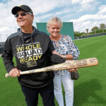 Ernie Withers holds a baseball bat signed with get well wishes next to his wife, Cindy, in the outfield on Field 1 on Thursday, Feb. 15, 2024, during a visit to Pirate City.