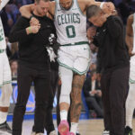 Trainers help Boston Celtics’ Jayson Tatum (0) off the court after he was injured during the second half of Game 4 in the Eastern Conference semifinals of the NBA basketball playoffs against the New York Knicks in New York.