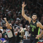 Play continued after Brown was knocked backward, with Tatum already having the ball in his hands on the right wing. He shuffled his feet — that was the uncalled travel — before stepping back and shooting over Toronto’s Ochai Agbaji.