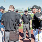Pirates manager Derek Shelton talks with Twins manager Rocco Baldelli and the umpires before the Grapefruit League opener against the Twins Saturday, Feb. 22, 2020, at LECOM Park in Bradenton.
